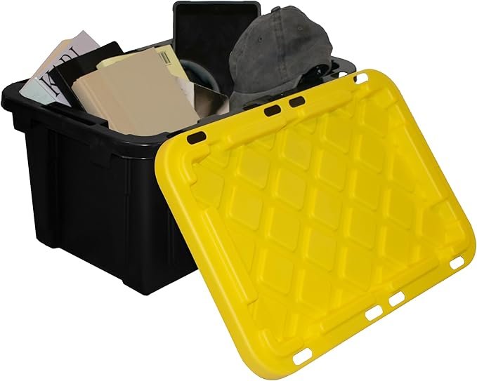 The Member’s Mark 27 Gallon Heavy-Duty Plastic Storage Tote provides a long-lasting, space saving, durable storage solution indoors and outdoors. Made of reinforced heavy-duty plastic, this 27 gallon heavy-duty tote will handle any storage job ranging from general storage needs to extreme storage jobs. The black base made from recycled polypropylene and yellow reinforced 6 position snap-fit lid secures and protects your valuables from pests, dust, and dirt. The deep recessed lid provides secure stacking, up to 4 totes high, to vertical storage. Integrated slots can be used to add zip ties or locks for extra security and the innovative tie-down channels allow it to be easily strapped down for simple and safe transportation. The molded handles make for a comfortable and ergonomic carry.