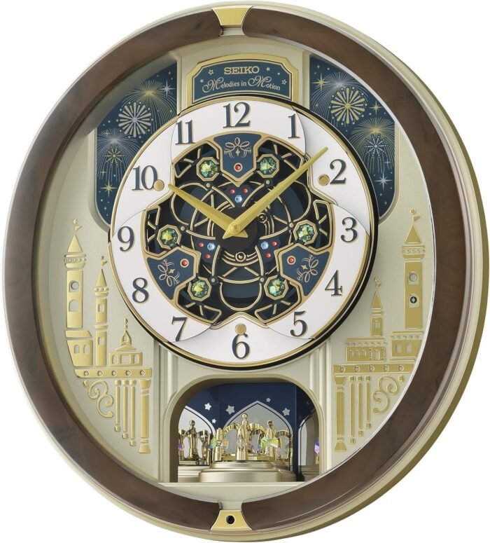 Sold exclusively at Sam’s Club, the 2024 Melodies In Motion “Concert Hall” will evoke years of precious family memories with each song played. This year’s clock is a spectacular showcase of fireworks in the night sky over a golden city scape. Experience the magic all year round of colorful fireworks. Melodies In Motion by Seiko is a whimsical musical clock which plays one of 45 high-fidelity melodies every hour while the dial on the face opens and spins. This year’s clock is adorned with 22 Preciosa crystals which sparkle and twinkle in the light. The frame of the clock is a faux brown marble design to fit into any decor. The light sensor ensures that the clock stays quiet in the dark. Enjoy this clock all year long with its 15 classical music box melodies, 10 holiday melodies and 20 all classic crystal bell melodies. The rotating pendulum adds sparkle and shine with each Preciosa Crystal precisely placed for optimum delight. Measuring 17.50 X 16 X 3.75 inches this spectacular wall clock will add beauty to any space. All Seiko clocks are equipped with crystal quartz movement making it the most precise in time keeping. Powered by 4 “C” batteries, included. This clock is perfect for any age to adult.