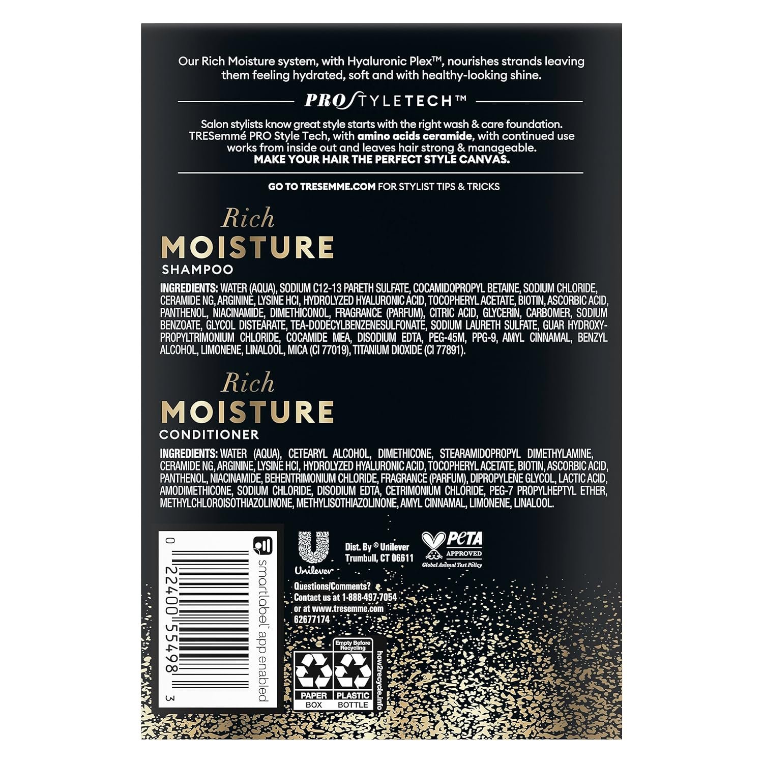 With Glycerin & Hyaluronic, TRESemmé Ultimate Moisture Shampoo and Conditioner system transforms dry, brittle strands to boost elasticity and leave hair intensely hydrated, smooth, and shiny for up to 72 hours.